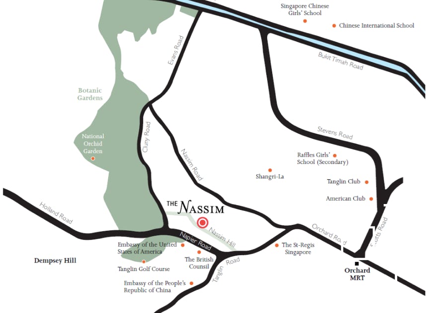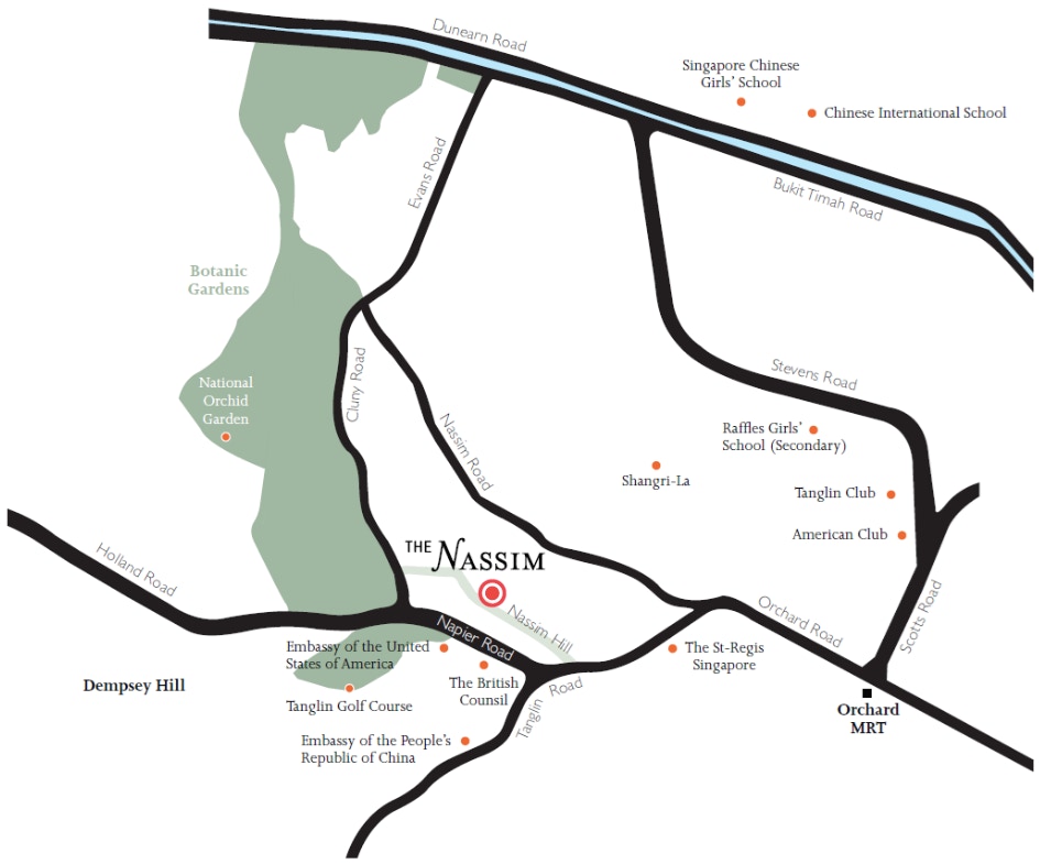 The Nassim is located at 18 Nassim Hill, District 10, Singapore. Centrally situated at the beginning of Orchard Road and Tanglin Road, Nassim Hill is just turn of the corner from the famous world-standard shopping belt in Singapore. Nestled in the lush neighbourhood, a vast of tranquillity greenery and gently tropical breeze.